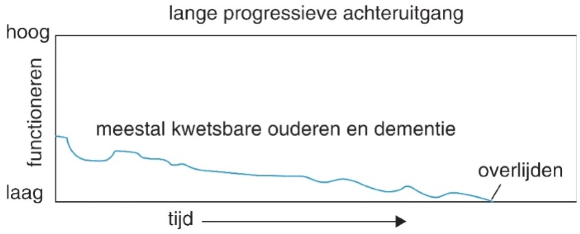 In onderstaande curve wordt de achteruitgang in functioneren weergegeven bij kwetsbare ouderen en bij ouderen met dementie.